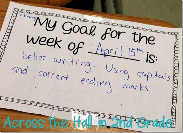 2. Besides lesson planning, teaching, grading, and all that stuff that goes along with student teaching that you have to do without pay, my student teacher also has to do an additional project. She gets to come up with her own idea, and she went with classroom goal setting. Each child met with her and discussed a possible goal. What we thought was pretty amazing was that many of them suggested a goal on their own that we were hoping to guide them towards. Throughout the week she checked in with them to make sure they were focusing on their goal. We also wrote them down and taped them to their desks.